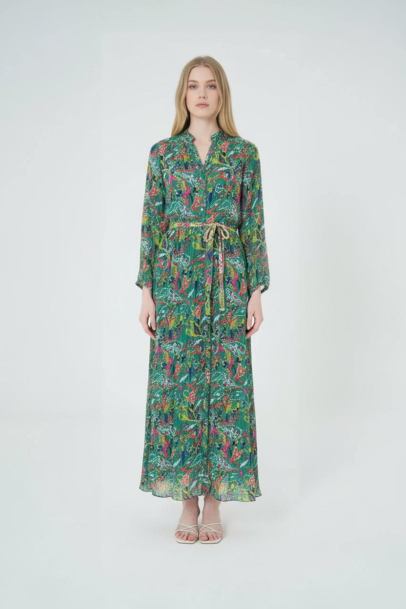أناقة محتشمة وراحة لا تُضاهى! هذا الفستان الماكسي ذو الأكمام الطويلة والياقة العالية مصنوع من قماش ناعم ومريح مثالي لأجواء الإمارات الحارة. تصميم مطبوع بالزهور يمنحك إطلالة عصرية أنيقة لكل المناسبات.