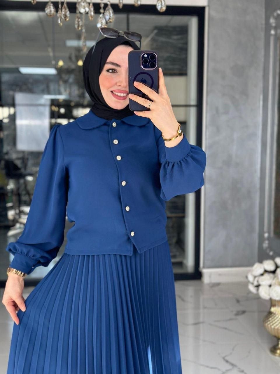.أضيفي لمسة من الأناقة العصرية والمنظمة إلى خزانة ملابسك مع هذا الطقم المكون من قطعتين باللون الرمادي المتوسط الجذاب. يتميز الجزء العلوي بتصميم بلوزة قصيرة بياقة كلاسيكية مستديرة وأزرار أمامية لؤلؤية، مع أكمام طويلة تنتهي بأساور عريضة تضفي مظهراً راقياً. تكتمل الإطلالة بتنورة ماكسي بليسيه (Pleated) بكسرات ضيقة ومنتظمة تمنحكِ حركة انسيابية مذهلة عند المشي، مما يجعل هذا الطقم الخيار المثالي لإطلالات العمل أو المناسبات النهارية التي تتطلب مظهراً محتشماً وأنيقاً في آن واحد في الإمارات.