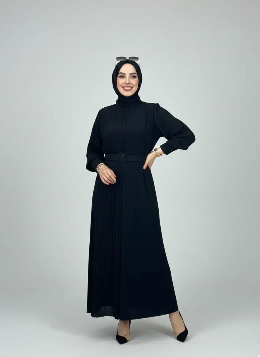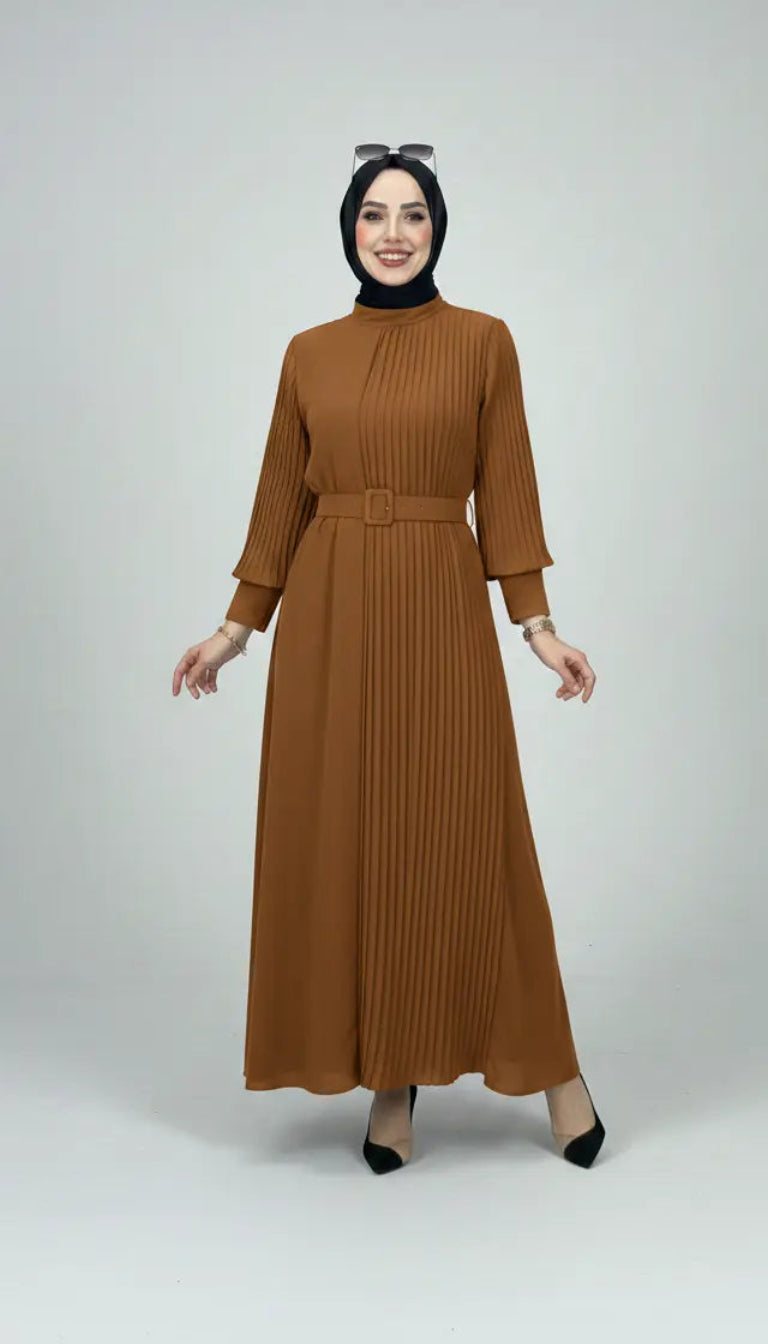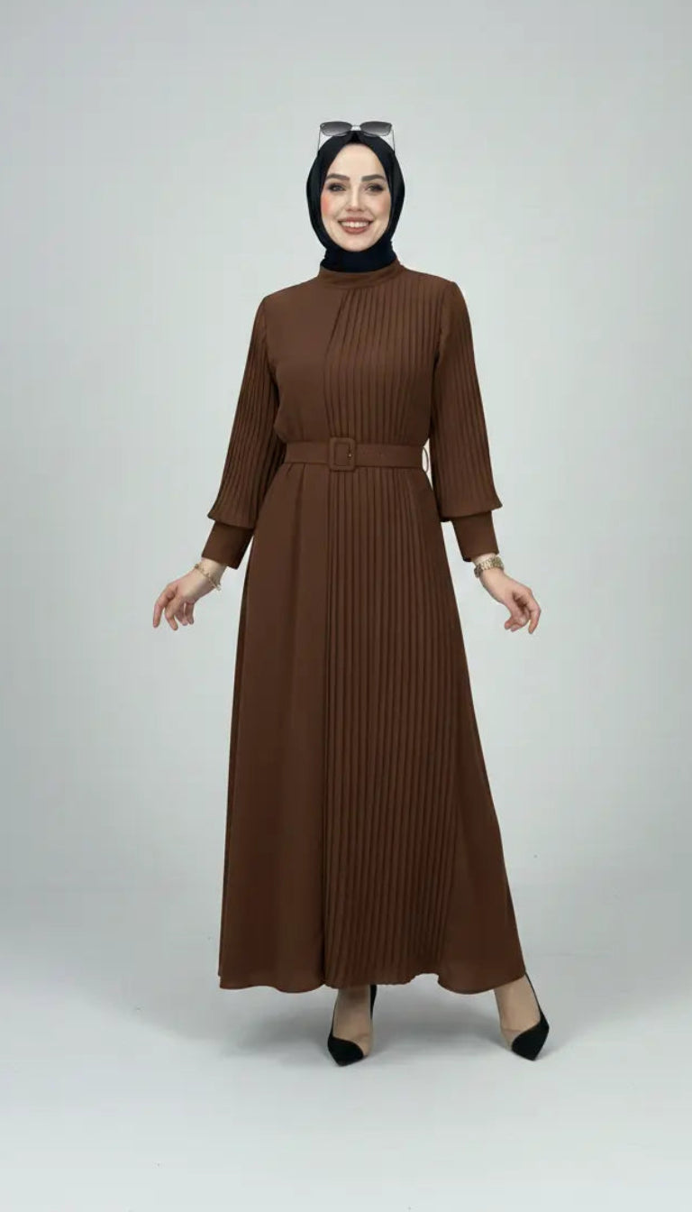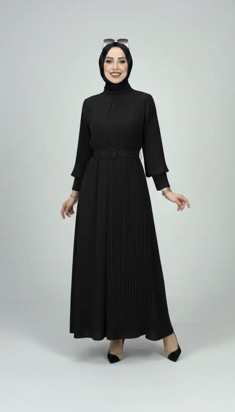 .تألقي بإطلالة مفعمة بالأنوثة والرقي مع هذا الفستان الطويل الذي يجمع بين التصميم العصري والتفاصيل الكلاسيكية الجذابة. يتميز الفستان بجزء علوي بياقة مرتفعة رقيقة، وينفرد بتصميم "بليسيه" (كسرات عمودية) أنيق يمتد على جانب واحد من الصدر والكم وحتى نهاية الفستان، مما يضفي لمسة من التباين والحركة الانسيابية. يأتي التصميم مع حزام خصر عريض من نفس القماش يبرز جمال القوام ويمنحكِ مظهراً متناسقاً، مما يجعله الخيار الأمثل للمناسبات الرسمية أو التجمعات الراقية في الإمارات التي تتطلب إطلالة محتشمة وفاخرة.