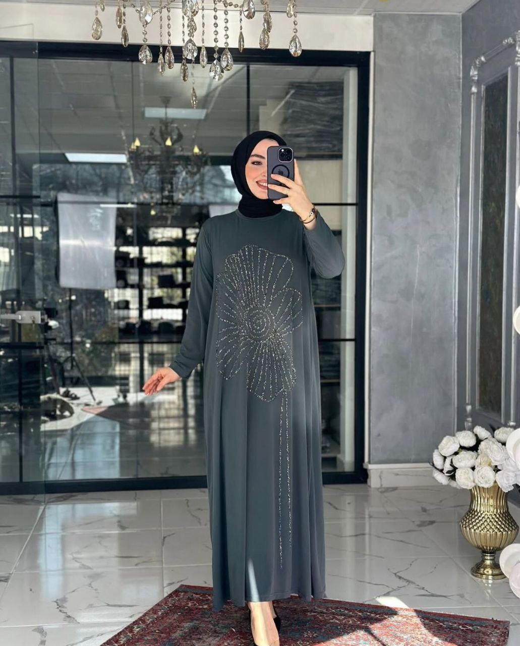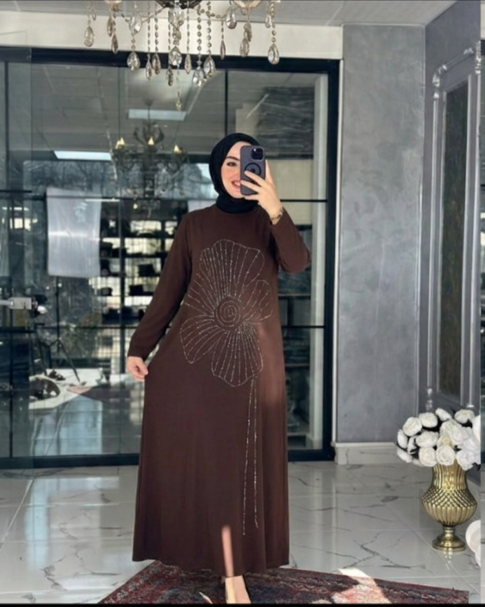 Radiate femininity and shimmer in this blue maxi dress, featuring a design that is both enchanting and effortlessly simple. The bodice is adorned with a large, delicate floral outline created from shimmering beadwork, featuring elegant beaded tassels that add fluid movement and a luxurious touch to the piece. Crafted with long sleeves and a relaxed, flowing fit, this dress is the perfect choice for family occasions or sophisticated social gatherings in the UAE, offering a modest yet radiant aesthetic.
