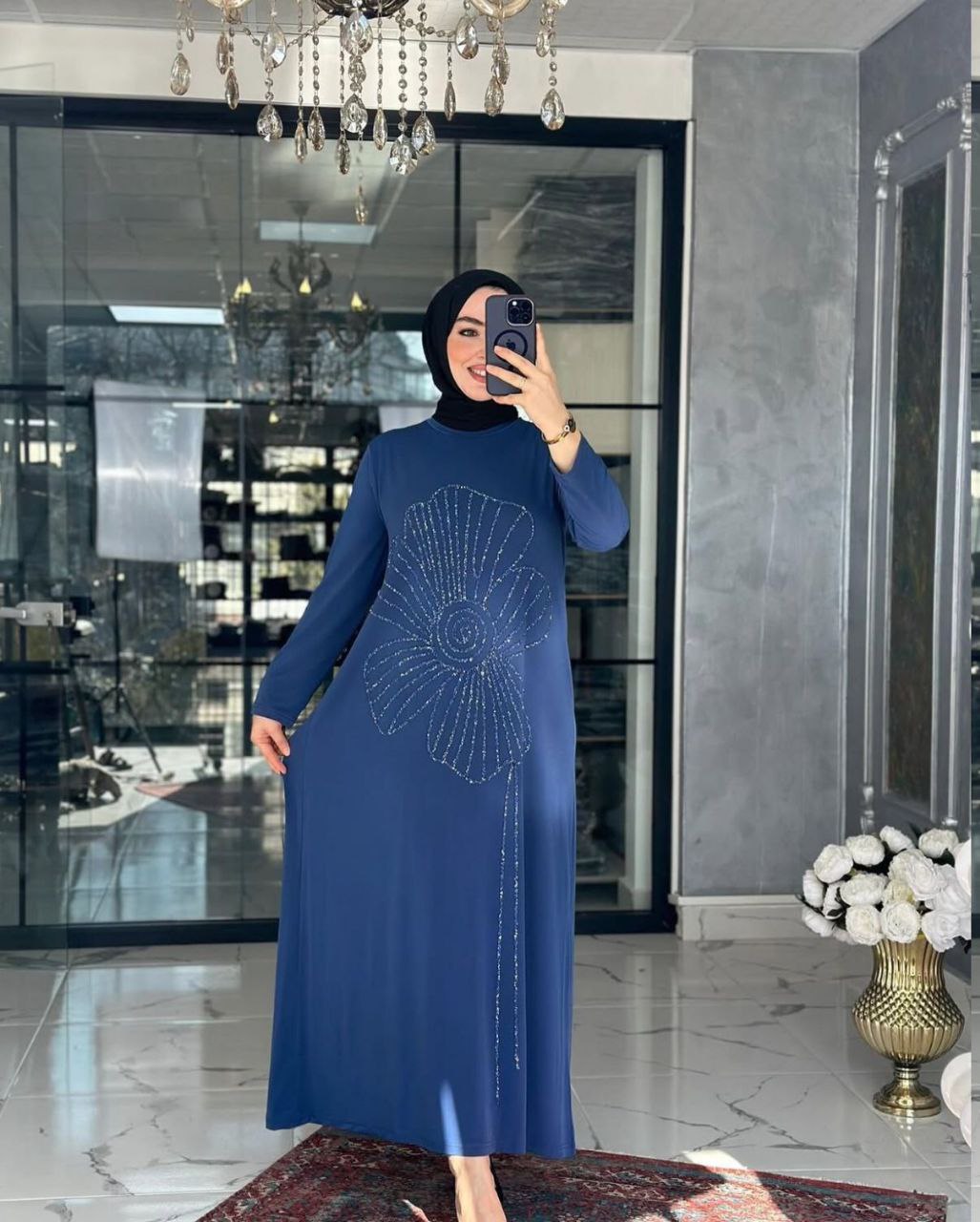 .تألقي بإطلالة مفعمة بالأنوثة والبريق مع هذا الفستان الماكسي الأزرق الذي يتميز بتصميم ساحر وبسيط في آن واحد. يزدان صدر الفستان بنقشة وردة كبيرة مطرزة بخرز دقيق ولامع، مع خيوط منسدلة من الخرز تضفي حركة انسيابية ولمسة من الفخامة على التصميم. صُمم الفستان بأكمام طويلة وقصة مريحة تنسدل بنعومة لتناسب مختلف الأجسام، مما يجعله قطعة مثالية للمناسبات العائلية أو التجمعات الراقية في الإمارات للمرأة التي تبحث عن الأناقة المحتشمة والبراقة.