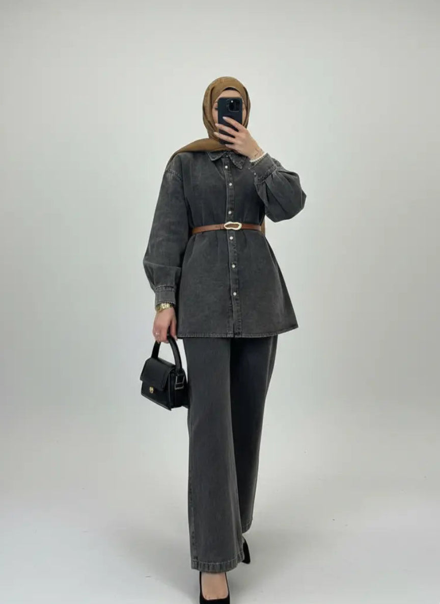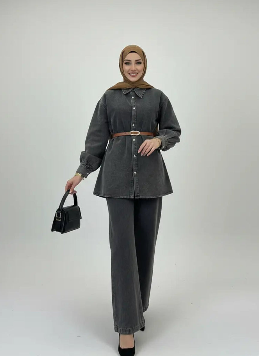 Elevate your casual wardrobe with this premium two-piece denim set, perfectly blending modern chic with ultimate comfort. The top features a sophisticated shirt design with voluminous puff sleeves for a feminine touch, paired with a stylish waist belt to define your silhouette and create a polished look. Completed with matching wide-leg trousers for a fluid and modest finish, this set is an ideal choice for your daily outings across the UAE.