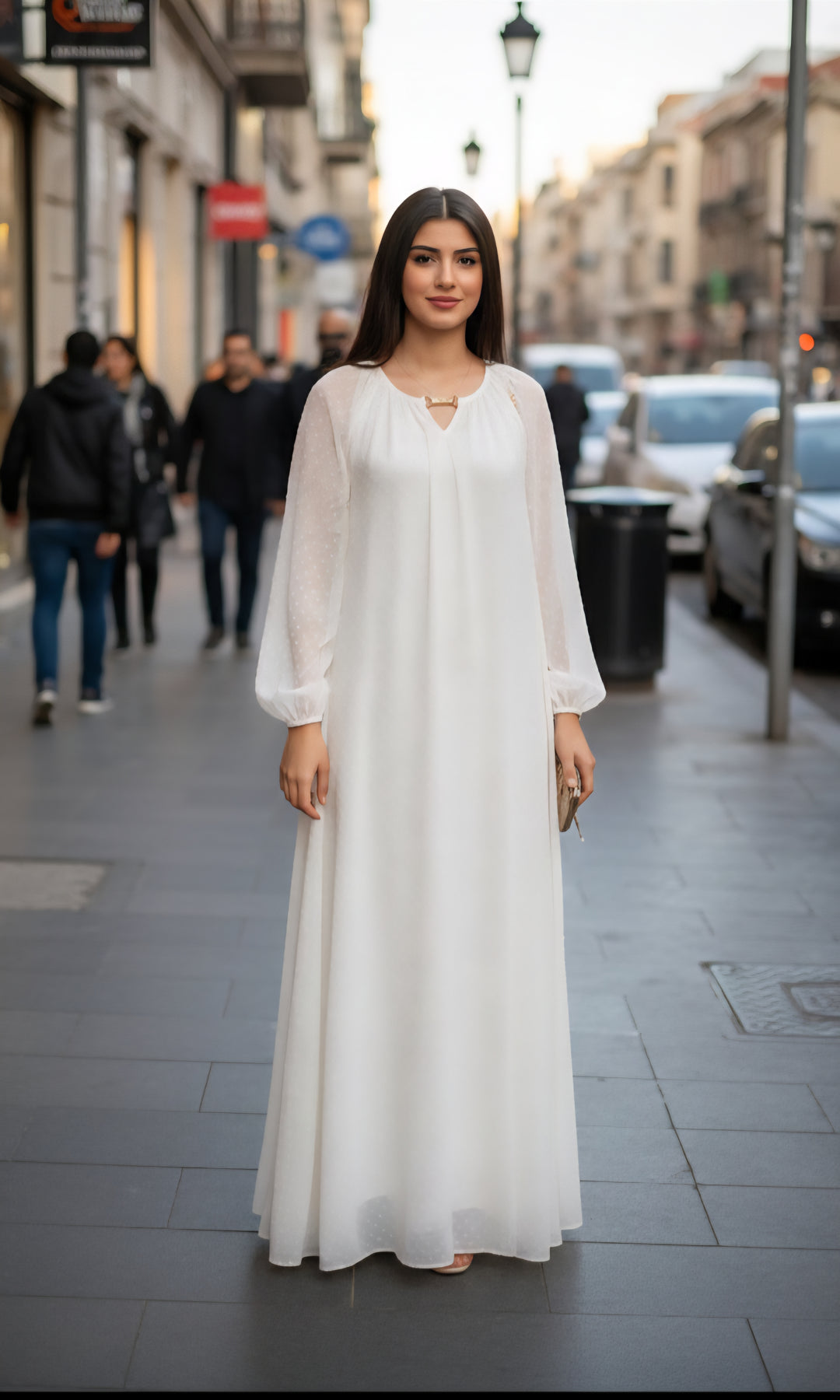 Embrace the purity of white with this soft gown crafted from lightweight chiffon, ensuring perfect breathability and freshness for the UAE climate. The design features elegant bishop sleeves with subtle polka-dot textures and a sophisticated neckline adorned with a gold-tone metallic accent for a touch of minimalist luxury. This gown is the ultimate choice for upscale daytime events or evening gatherings, offering a look that is modern, modest, and effortlessly comfortable.