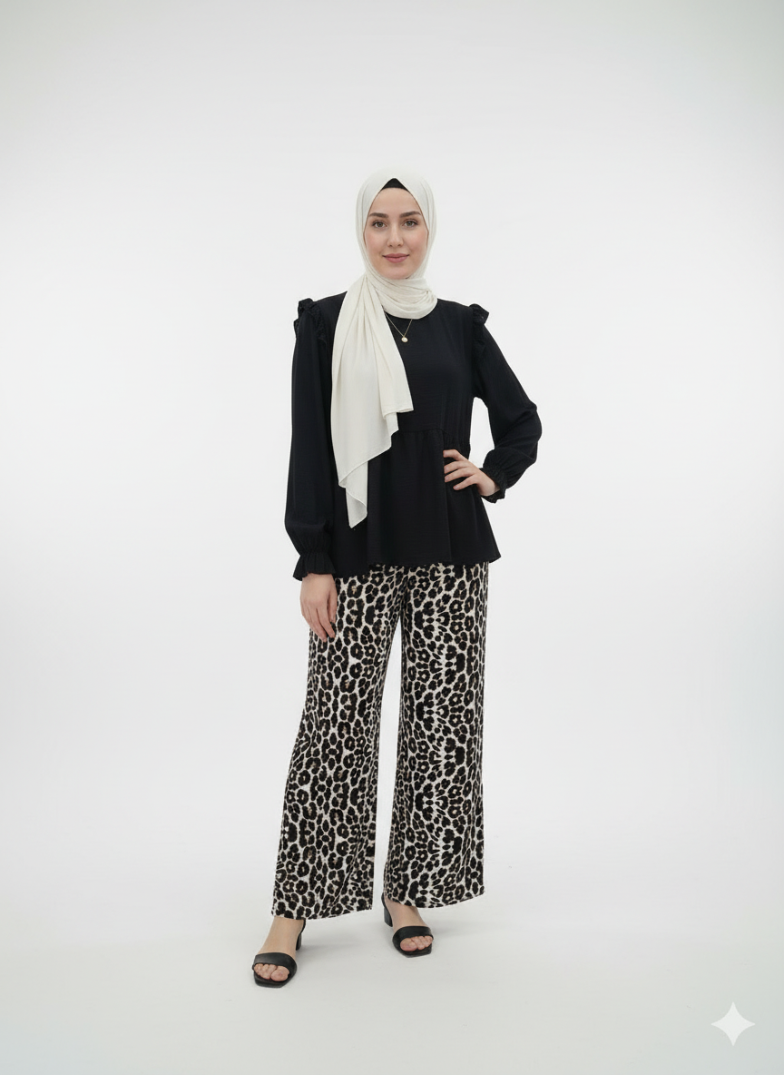 لإطلالة عصرية ومريحة في الإمارات، اختاري هذا البنطال الواسع بنقشة النمر. مصنوع من خامة ناعمة وخفيفة، مثالي لإطلالة محتشمة ومميزة طوال اليوم، سواء للعمل أو للتسوق.