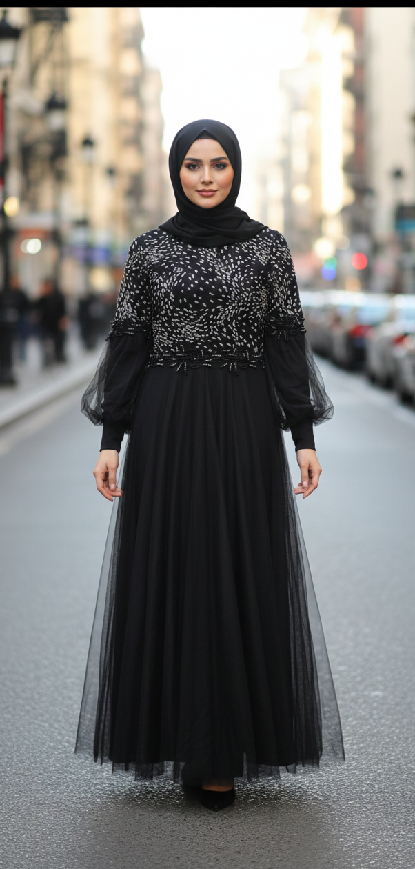 Prepare for luxurious occasions in the UAE with this elegant dress crafted from soft, lightweight fabric that ensures total breathability and comfort, featuring delicate embellishments on the bodice and flowing sleeves that add a touch of sophistication and modest beauty.