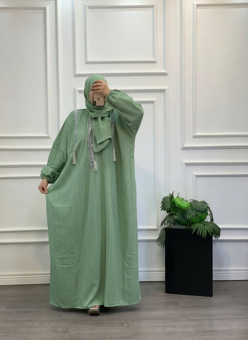 This distinctive and modest abaya set features a soft, comfortable fabric with elegant vertical stripe details and tassel ornamentation at the neck, offering full coverage and a relaxed, appealing look perfect for women in the UAE.