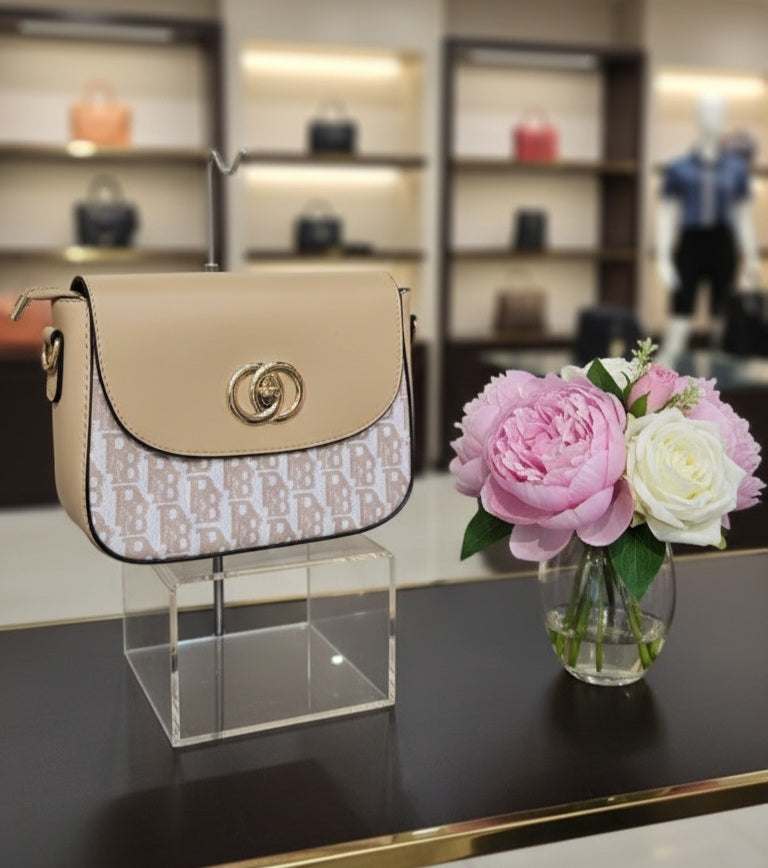 Add a touch of classic sophistication to your daily ensemble with this refined crossbody bag, crafted from premium soft-touch materials. Featuring a trendy monogram print paired with a solid-color flap and a striking circular gold-tone clasp, this bag offers a luxurious yet practical look perfect for your lifestyle across the UAE.