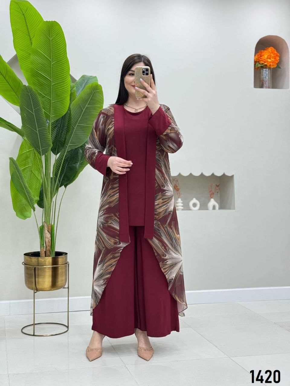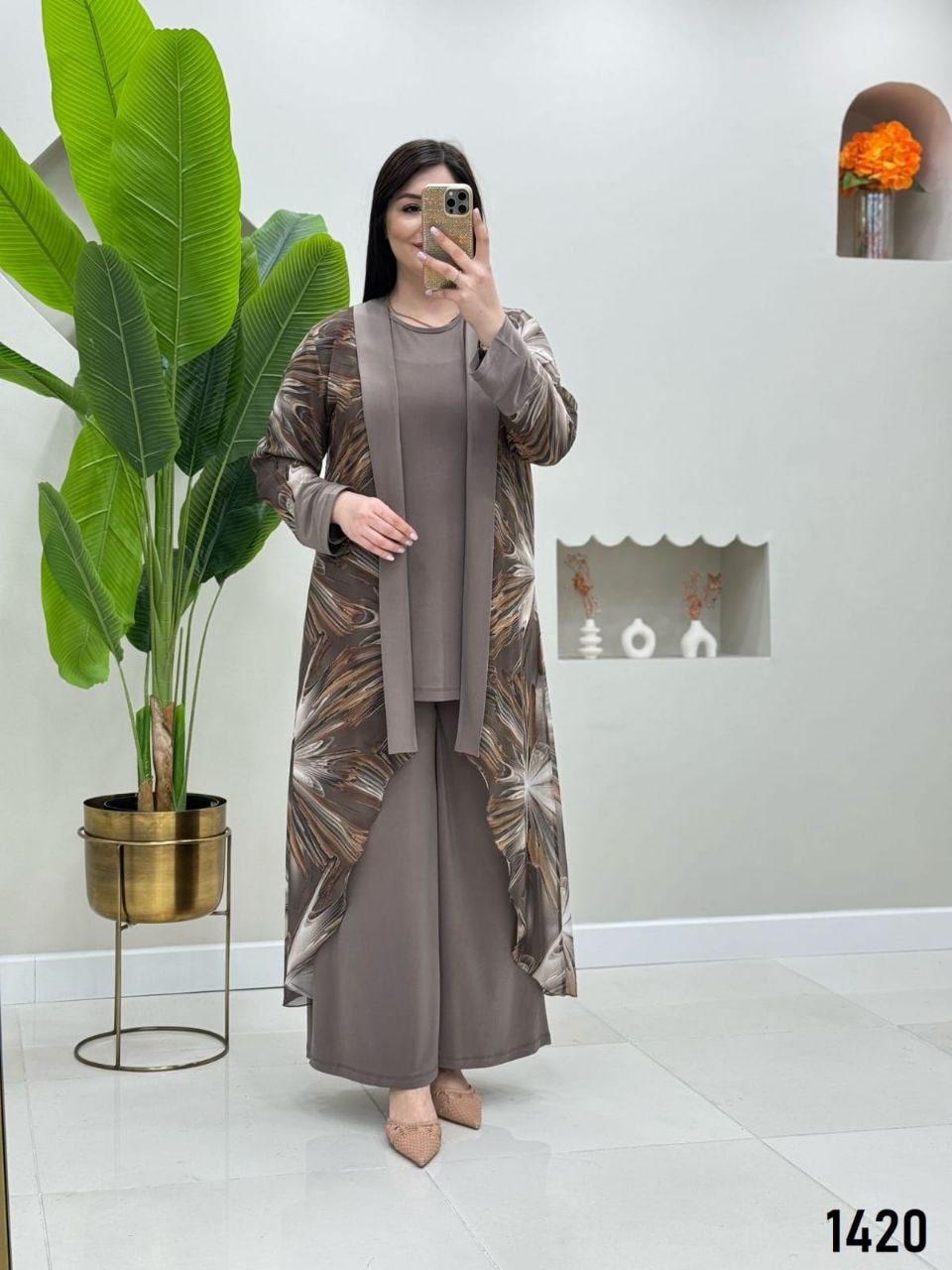 Embrace modern elegance and modesty with this sophisticated three-piece set in a soft mauve hue, perfectly designed for the stylish woman in the UAE. The ensemble features a long-line outer kimono adorned with fluid abstract floral patterns, paired with a matching inner top and wide-leg trousers for a cohesive and refined silhouette. Crafted from premium, lightweight, and breathable fabric, this set ensures maximum ventilation and all-day comfort, making it an ideal choice for social gatherings or elegant daily wear.