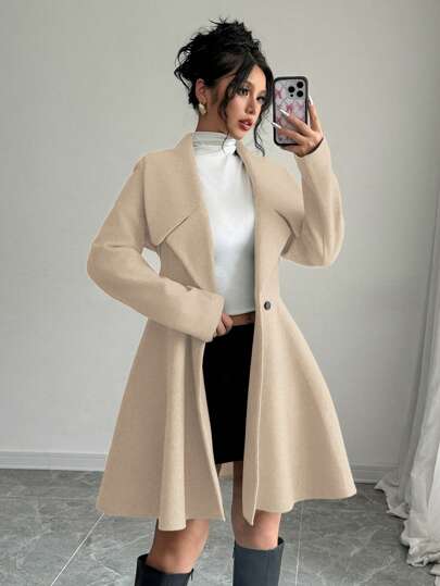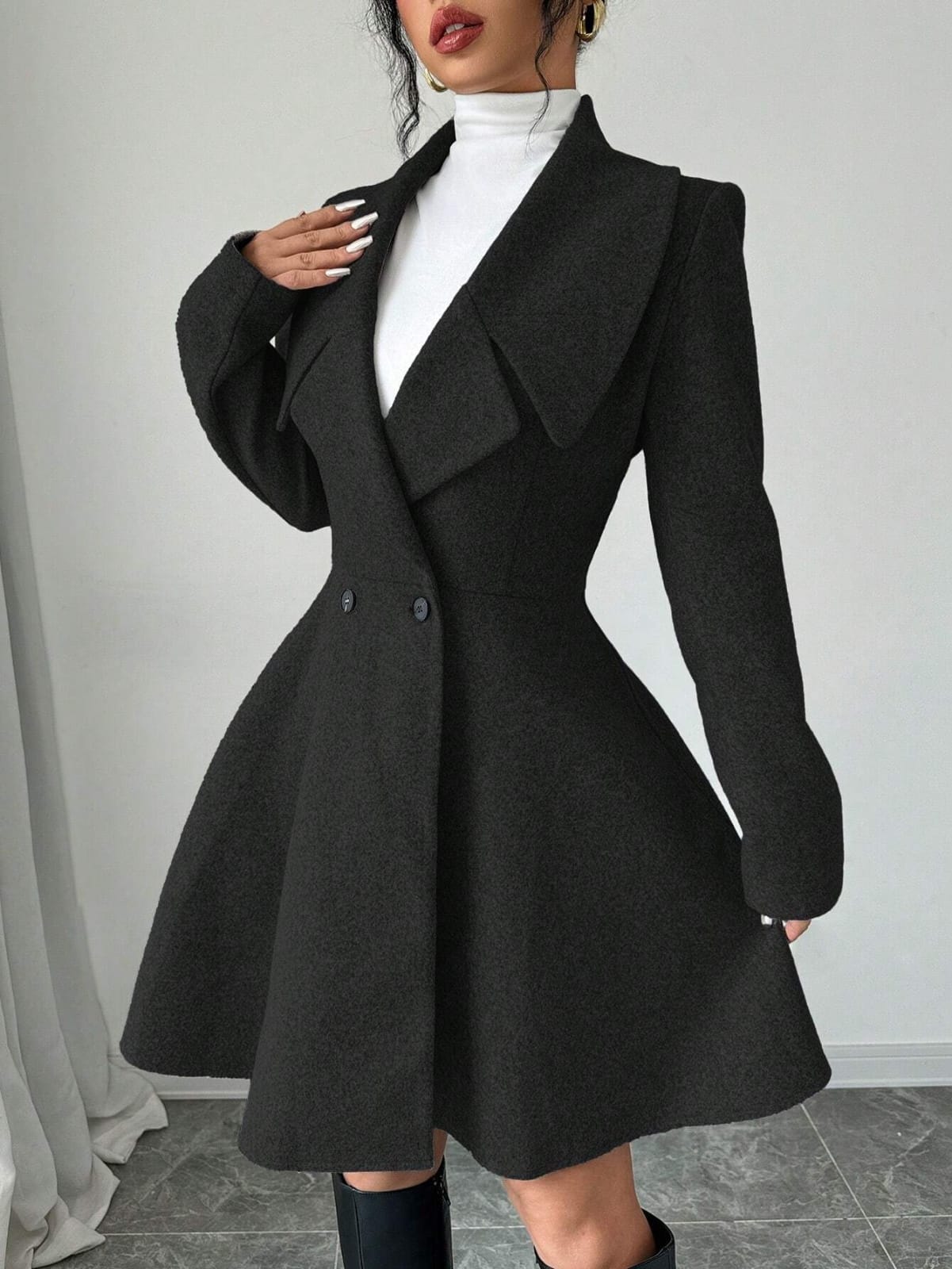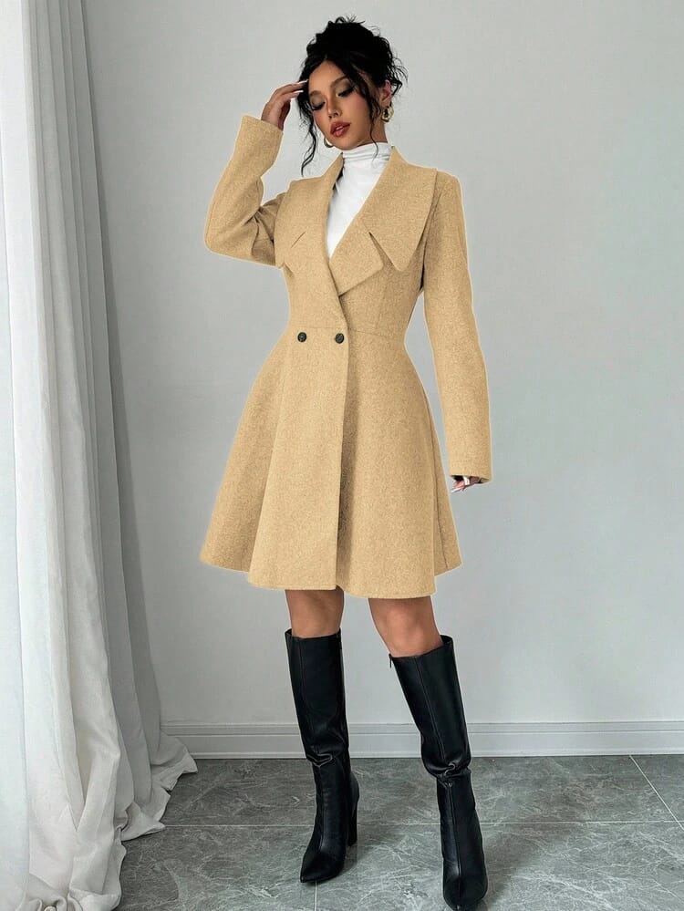 Add a touch of Parisian chic to your winter wardrobe with this luxurious short coat, crafted from premium soft-wool fabric for a blend of warmth and sophistication. The design features a tailored waist that flows into a graceful flared hem, creating a feminine and structured silhouette. Accented with striking wide lapels and classic double-breasted buttons, this coat is the perfect statement piece to pair with high boots or tailored trousers for an elevated winter look in the UAE.