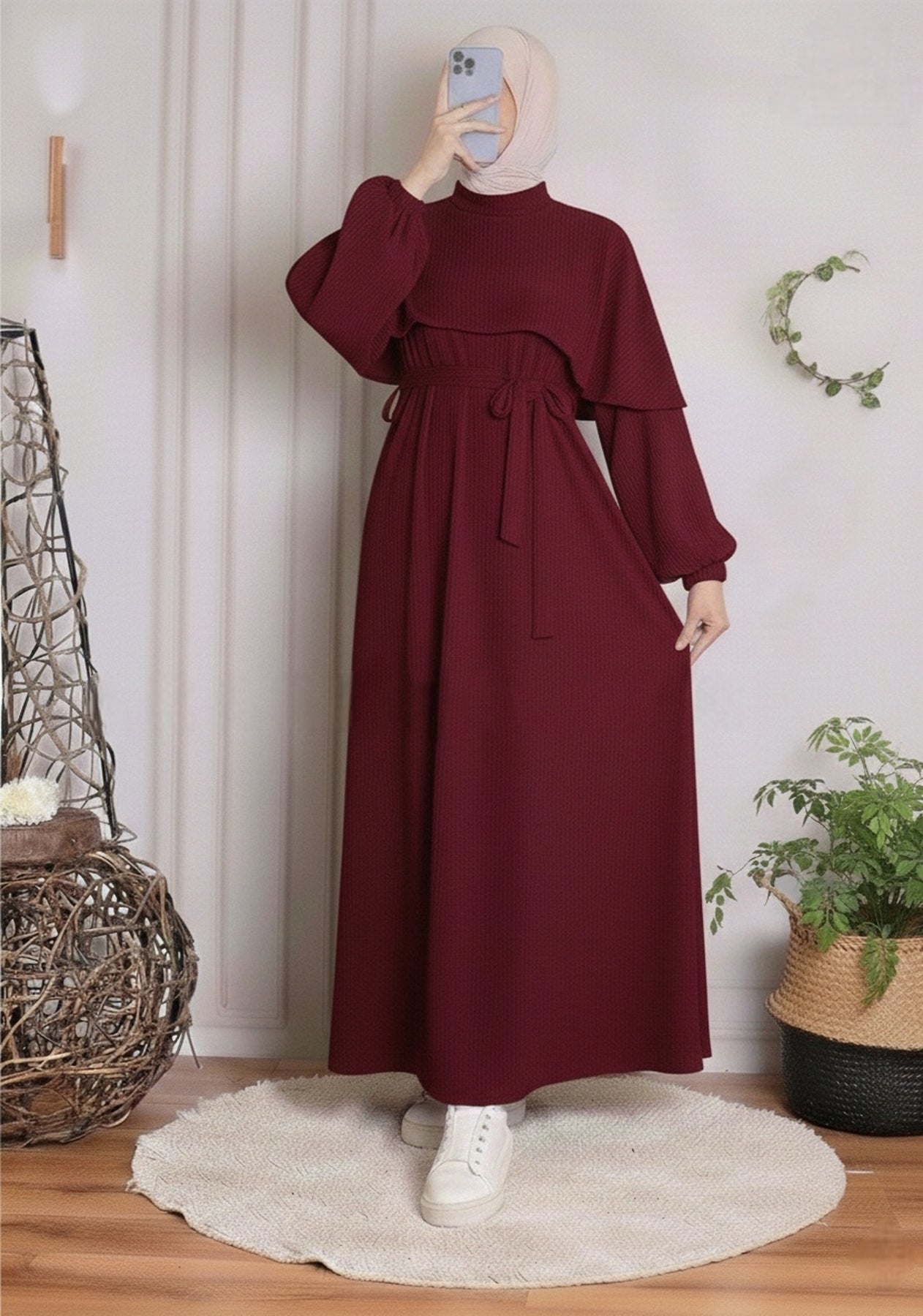 Add a touch of warm luxury to your wardrobe with this elegant dress crafted from soft corduroy fabric, perfectly blending comfort and sophistication. The design features a flattering empire waistline with a matching tie-belt to define your silhouette, paired with dramatic bishop sleeves for a classic, elevated look. This dress is a timeless choice for winter gatherings or high-end daily wear across the UAE.