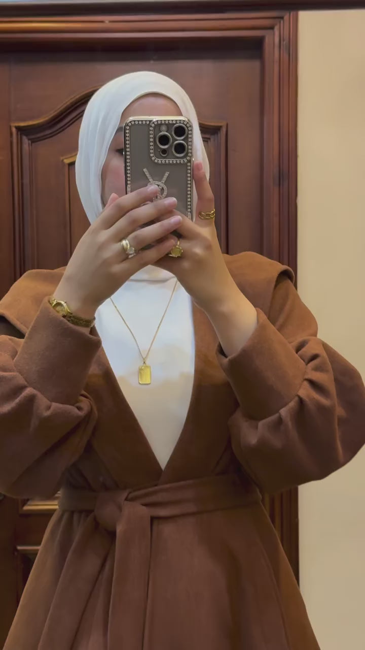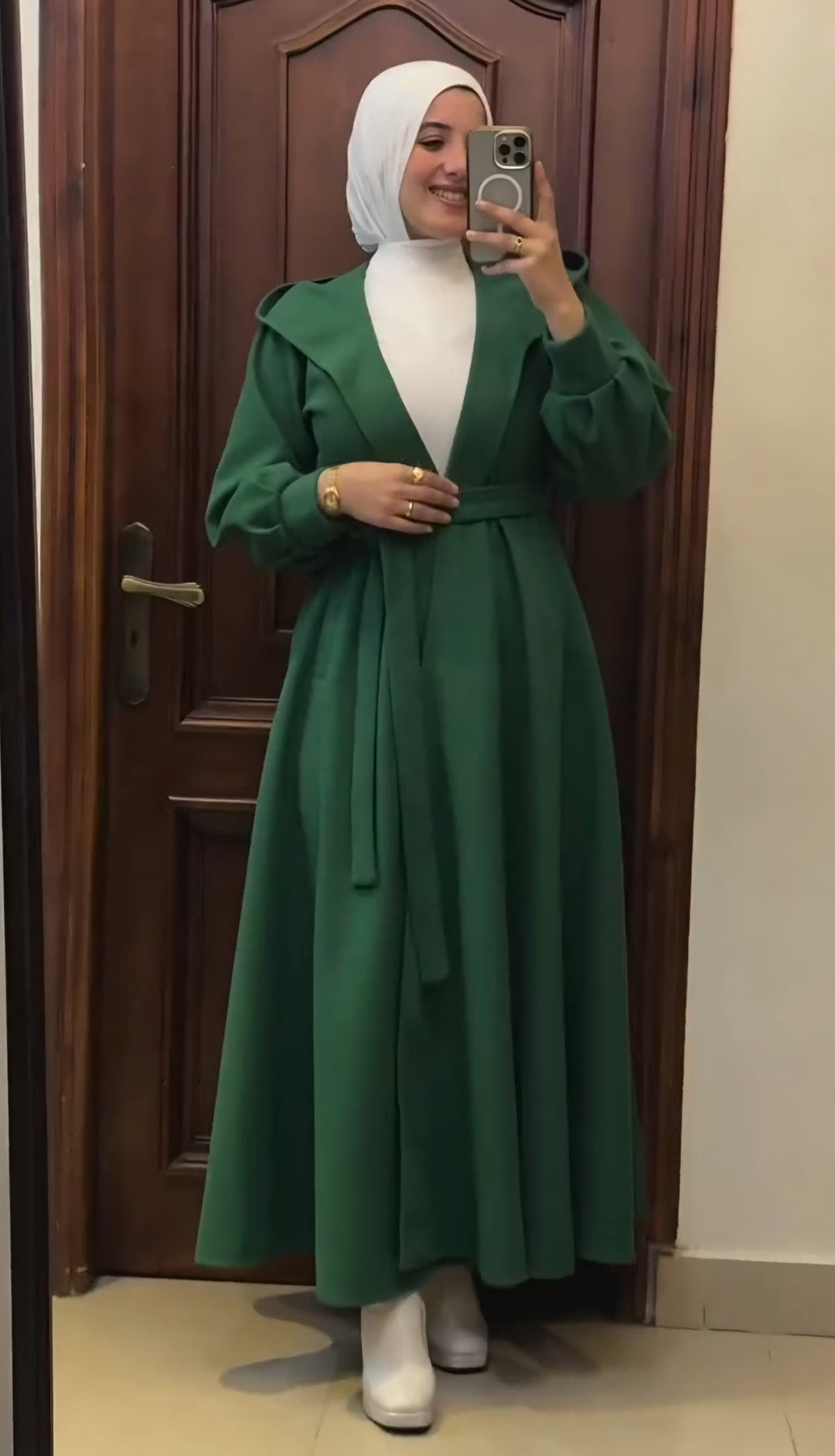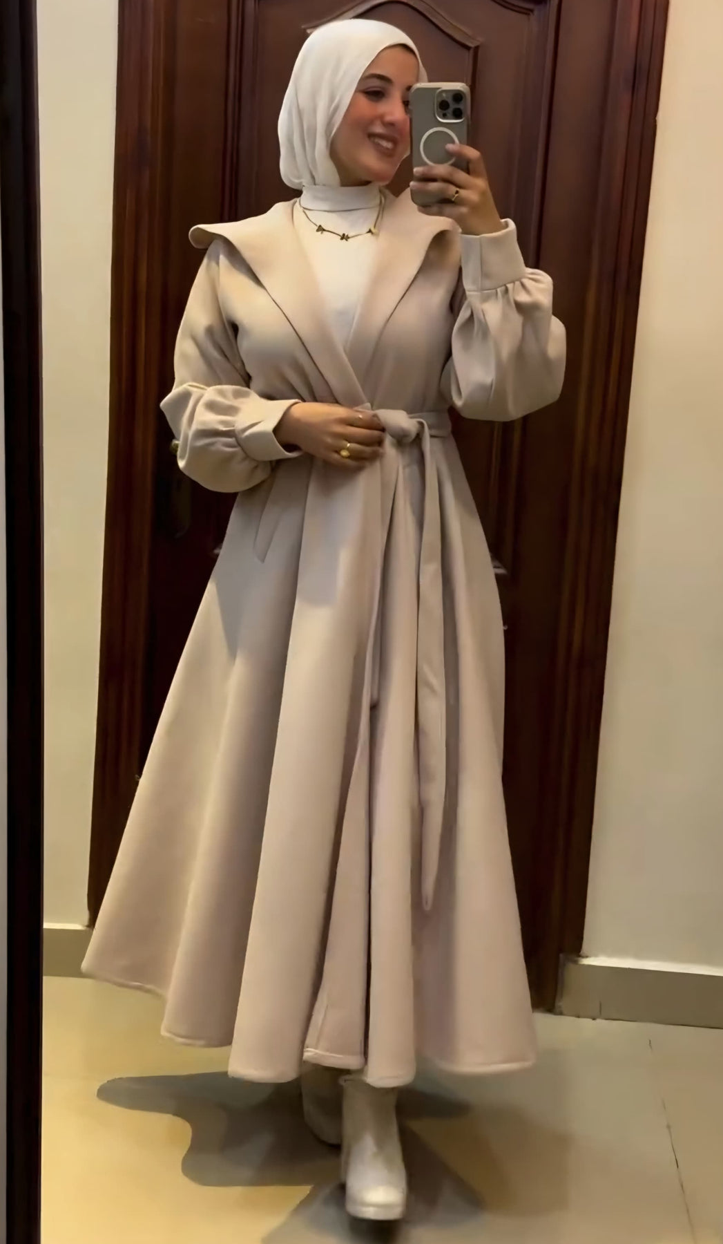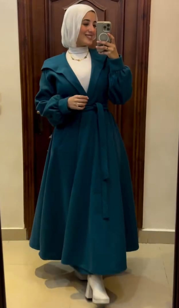 استقبلي الأجواء الباردة بفخامة لا تضاهى مع هذا المعطف الطويل المصنوع من نسيج صوفي ناعم يمنحكِ الدفء والرقي في آن واحد. يتميز التصميم بقصة "كلوش" واسعة من الأسفل تضفي لمسة ملكية، مع أكمام منفوخة تنتهي بأساور عريضة وحزام خصر أنيق يبرز جمال القوام. يأتي المعطف مع ياقة عريضة منسدلة تجعل منه قطعة مثالية فوق ملابسكِ اليومية أو الرسمية، مما يضمن لكِ إطلالة محتشمة وفاخرة تناسب ذوقكِ الرفيع في الإمارات.